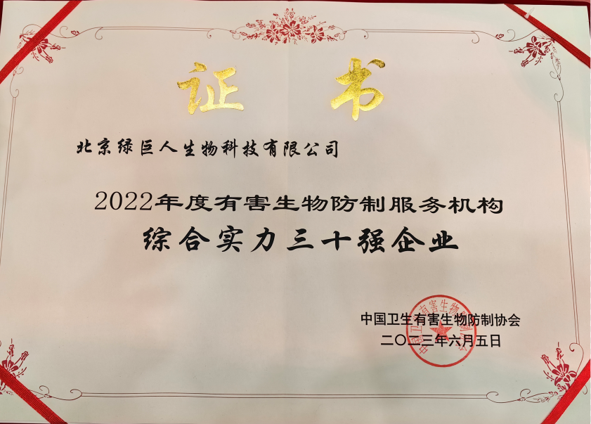 北京綠巨人生物科技有限公司在2023年全國消殺大會(huì)上,蟬聯(lián)“年度有害生物防制服務(wù)機(jī)構(gòu)綜合實(shí)力30強(qiáng)企業(yè)”稱號(hào),贏得了專家、領(lǐng)導(dǎo)單位和客戶的一致好評(píng)。“北京綠巨人”已連續(xù)多年獲得本殊榮,是社會(huì)各界對(duì)北京綠巨人生物科技有限公司在PCO領(lǐng)域的實(shí)力和引領(lǐng)地位的充分肯定。